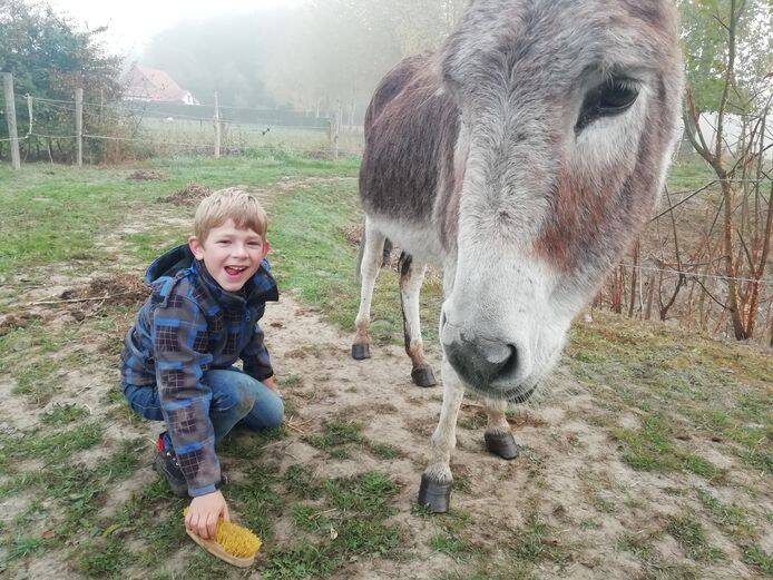 Een van de kinderen noemt zichzelf een expert in het borstelen: 'deze is om te borstelen en deze om te krabben. Je klautert niet op een ezel zonder hem eerst te verzorgen.