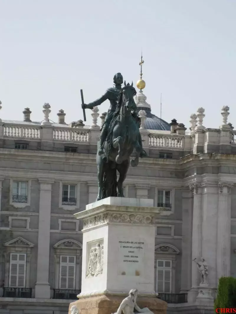 Centraal staat het spectaculaire beeld van Koning Filips IV van Spanje op zijn steigerende paard. Dit is het eerste ruiterstandbeeld waarbij het paard op de achterbenen en de staart rust. Het 8150 kg wegende bronzen ruiterstrandbeeld is een ontwerp van de Italiaan architect Pietro Tacca. Het was het eerste 'geslaagde' beeld van een steigerend paard. De Italiaanse natuurkundige, Galileo Galilei maakte berekeningen voor het juiste evenwicht van het beeld: de achterkant is massief, het voorste deel is hol.