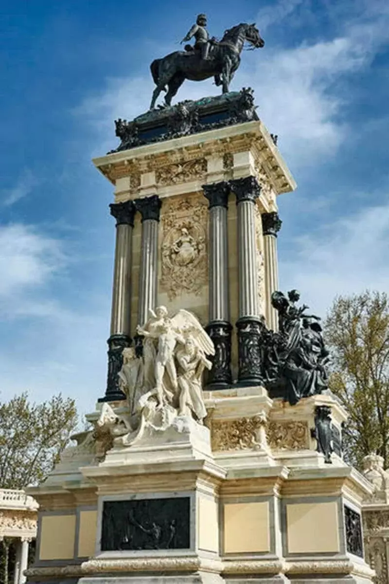 Op de oostelijke oever van het meer zie je een halfronde stenen zuilengalerij, die de achtergrond vormt voor een bronzen monument voor Alfons XII. Het beeld werd onthuld door zijn zoon, Alfonso XIII, die op de dag van zijn huwelijk een bomaanslag overleefde. Hij was gewaarschuwd voor de aanslag door een boodschap die in een boom van het park was gekerfd.