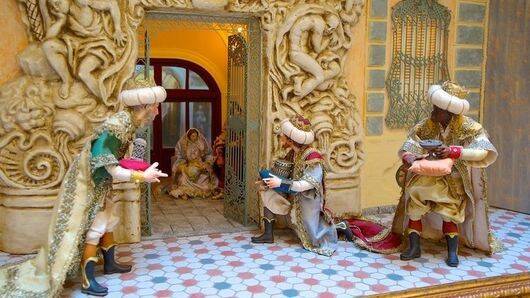 's Avonds, wanneer de voorgevel van het paleis wordt verlicht, schittert dit kunstwerk met een bijzondere glans.