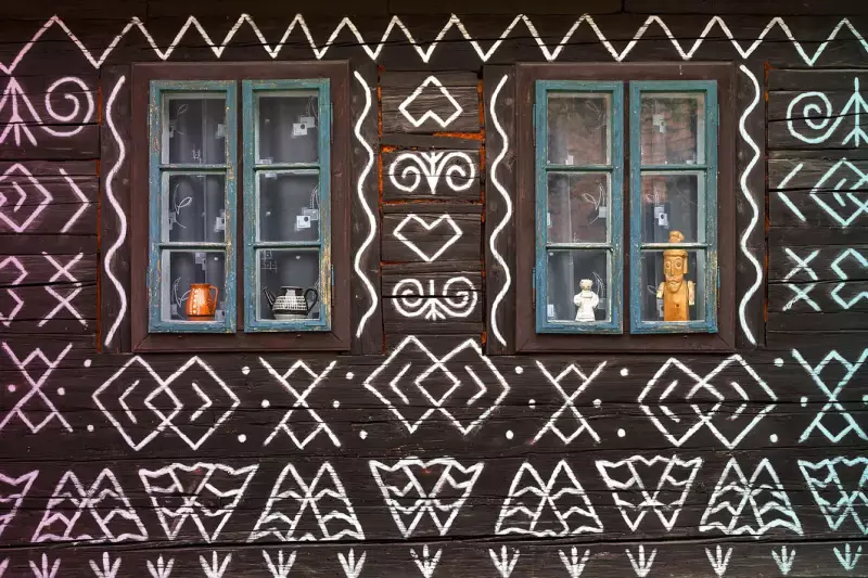 We komen in het dorpje Cicmany dat vol staat met houten huisjes met geometrische motieven. We kunnen ons hullen in de lokale klederdracht. We zien de grootste houten kerststal van het land, een pareltje van houtsculptuur. Dit dorpje in een afgelegen vallei is ooit gesticht door, voor de Turken, vluchtende Bulgaren. Zij hebben de traditie meegenomen om hun huizen met allerlei motieven te beschilderen.